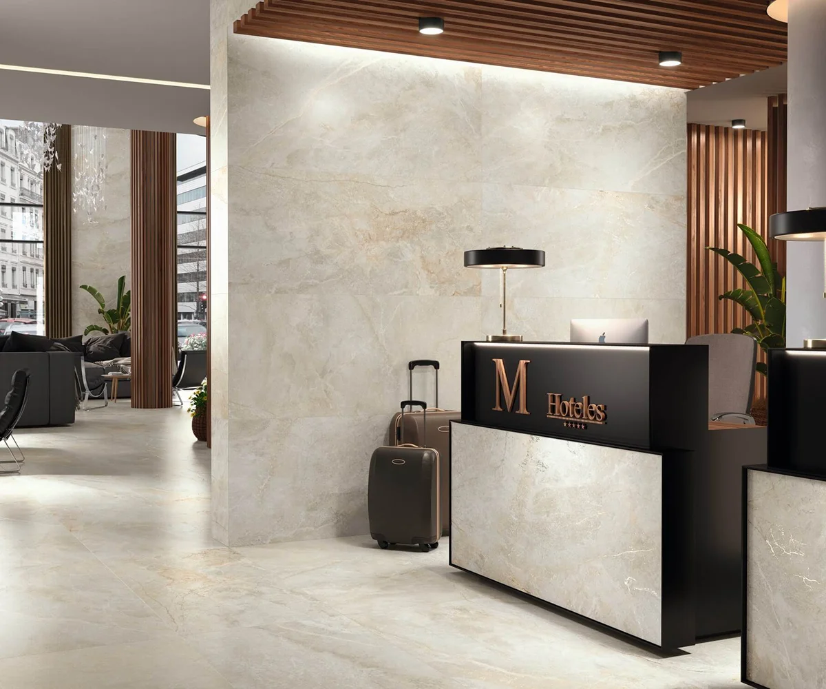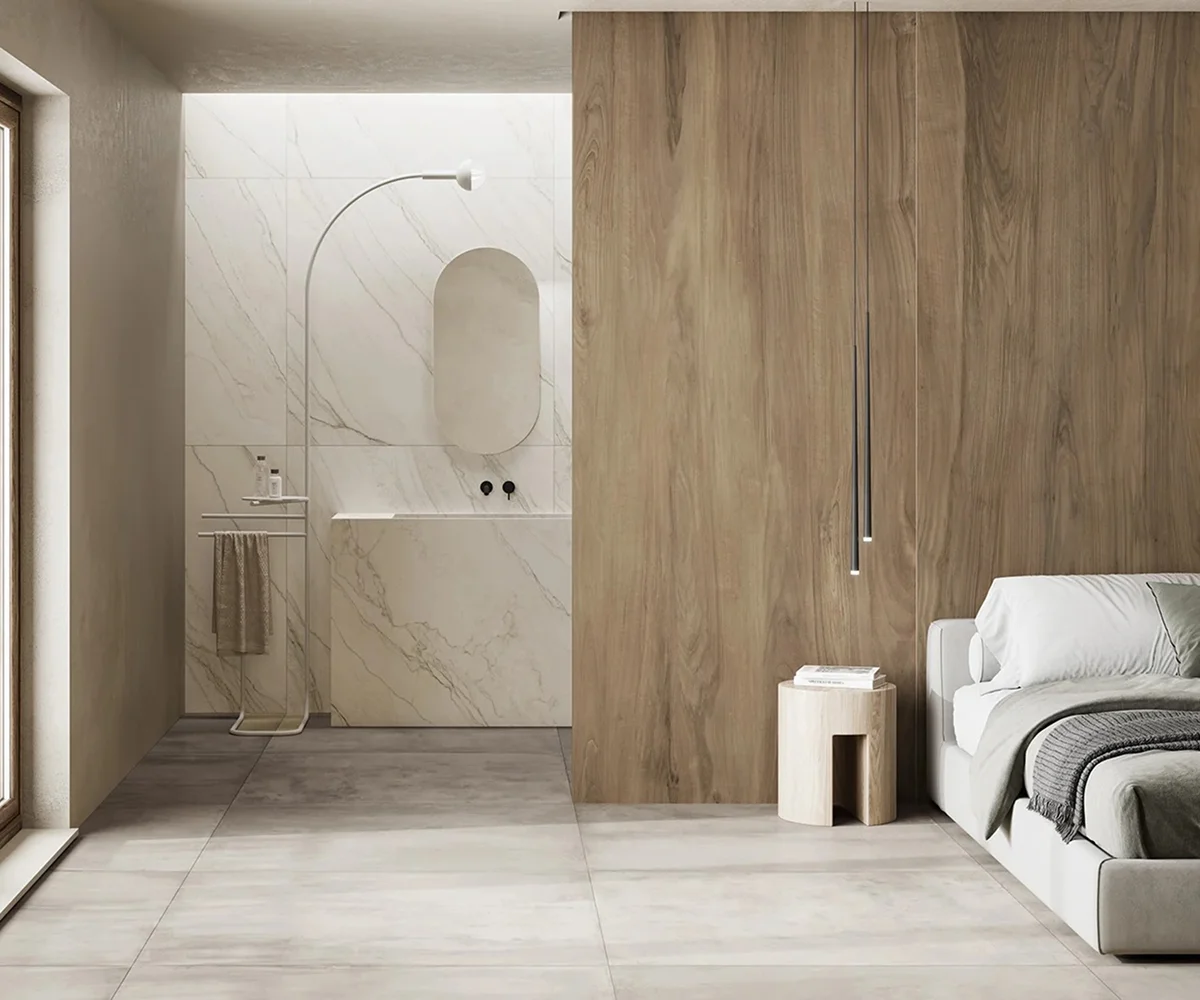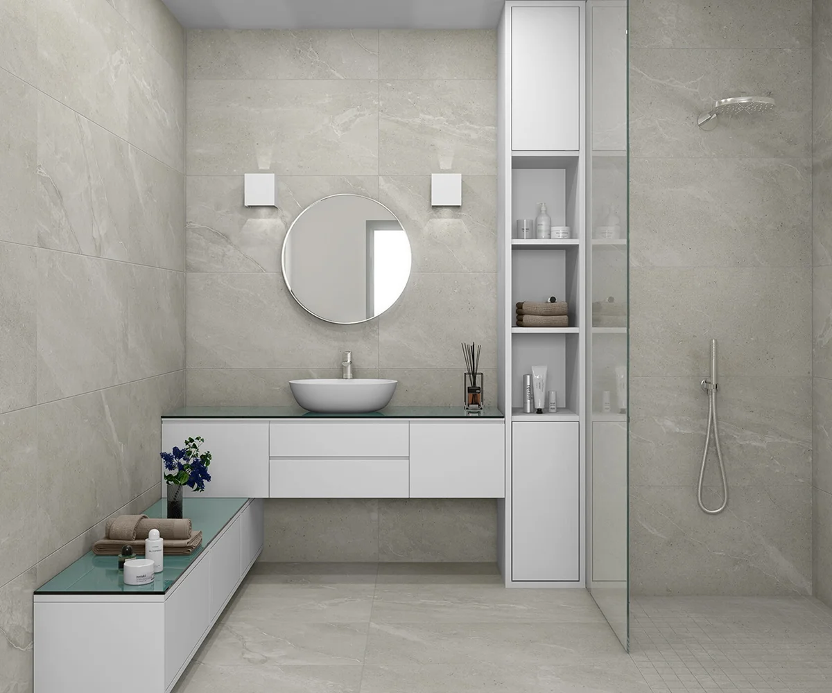 Les carreaux XXL créent une continuité visuelle, réduisant les joints et sublimant l’esthétique de votre salle de bains.